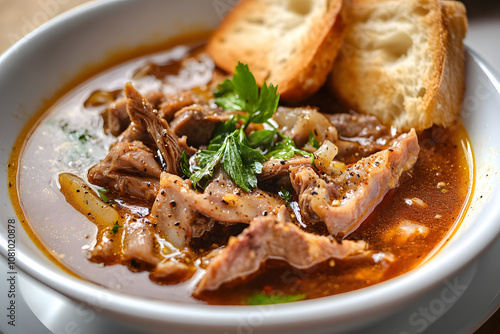 Tasty soup or stew made of beef tripe and spices. Spicy and aromatic tripe soup seasoned with pepper and served with bread