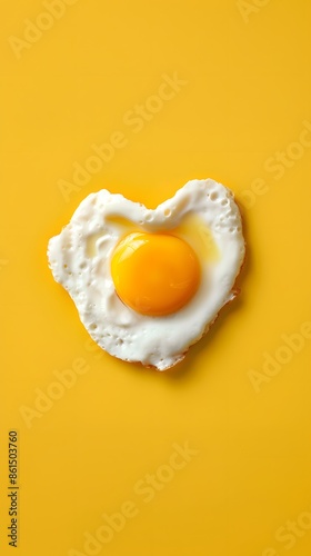Tasty sunny egg love heart shaped on yellow background ready to serve for breakfast, view from above. copy space concept, vertical.