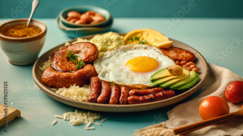 Tasty traditional Colombian food. Juicy Bandeja Paisa. Generative AI.