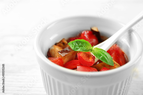 Tasty vegetarian ratatouille made of eggplants, squash, tomatoes in bowl on wooden table background