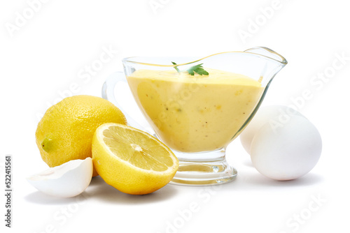 Tasty yellow hollandaise sauce in glass bowl gravy boat isolated on white background