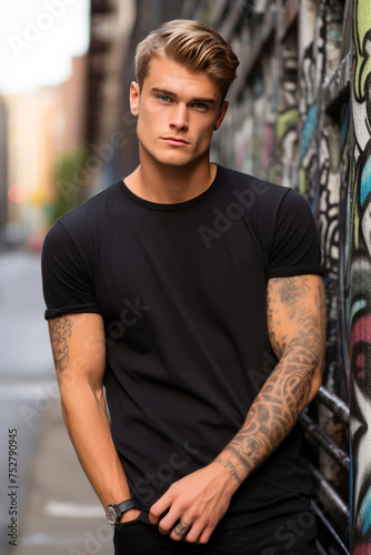 model, male, tattoo, black, tee, urban, style, confident, pose, fashion, casual attire, trendy, modern, portrait, young, masculinity, cool, tattooed, arm, attitude, lifestyle, ink, culture, contemporary, strong, presence, look, stylish, edgy, individuality, city, hip, sharp, man, masculine, youthful, tattoo, bold, attire, expression, character, physique