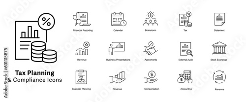 Tax Planning and Compliance Icons. Tax management icons, Tax strategy icons, Tax optimization icons, Tax compliance symbols, Tax planning vector icons, Tax regulations icons. Editable Stroke.