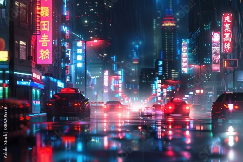 Taxi is driving down a busy city street at night in the rain, with neon signs reflecting in the wet asphalt