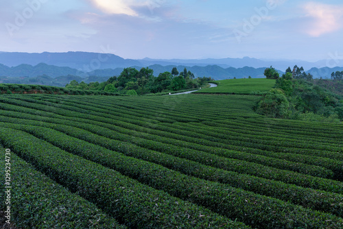 Tea garden in the morning. Tea garden in the morning light. Tea garden and distant mountains.