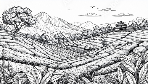nobody, indonesia, vale, engraving, tone, bush, isolated, image, morning, closeup, darjeeling, element, sky, flora, view, white, farm, trail, product, landscape, vignetting, illustration, china, hill, crayons, draw, retro, asia, nature, graphic, row, vector, plantation, agriculture, herb, india, vintage, field, grow, drawing, mountain, tea, food, green, harvest, art, background, tree, hand-drawn