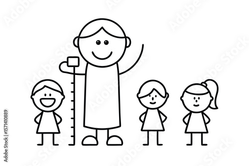 teacher, children, ruler, measuring, education, school, learning, growth, simple, line art, black-and-white, illustration, people, children, measurement, height, comparison, classroom, drawing, graphic, cartoon, playful, happy, white background, vector, elementary, kindergarten, student, lesson, teaching, cognition, development, academic
