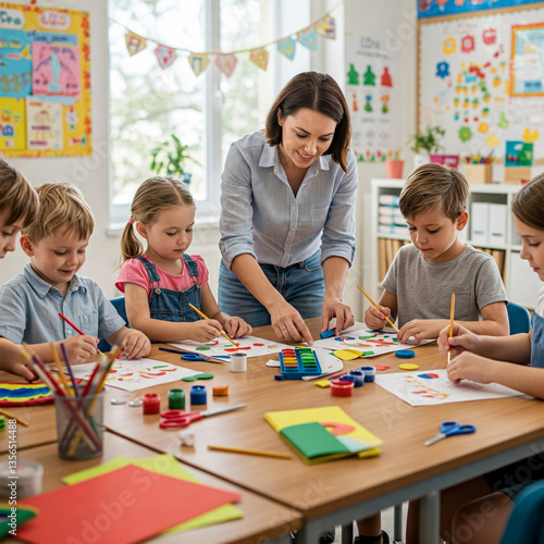 Teacher guiding children in art class, painting and crafting colorful shapes on paper, fostering creativity and learning in a classroom setting