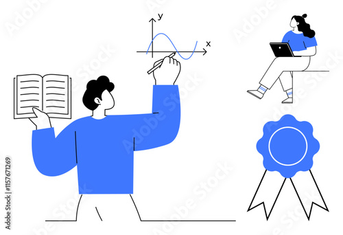 Teacher holding book and drawing graph, student using laptop, achievement ribbon below. Ideal for education, online learning, teaching, student engagement, academic success, instructional materials
