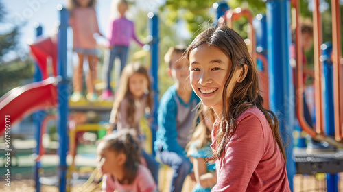 Teacher supervising recess play – children playing on a playground, teacher watching with a smile, casual outdoor setting.