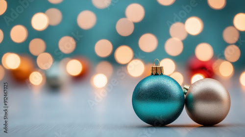 christmas, ornament, bauble, decoration, holiday, festive, seasonal, winter, teal, silver, bokeh, blurred, light, sphere, round, glasses, tradition, celebration, merry, christmas tree, closeup, nobody, indoor, evening, atmosphere, mood, minimal, decorative, christmas, christmas, december, shiny, metallic, elegant, modern, contemporary, 2, pair, table, surface, copy space, soft focus, glistering