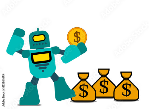 Teal robot cartoon character vector design holding dollar symbol coin money illustrating about smart investment and Financial Gain or Automated Wealth Management