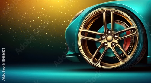 Teal sports car's gold-rimmed wheel, close-up, set against a dark, glittering background