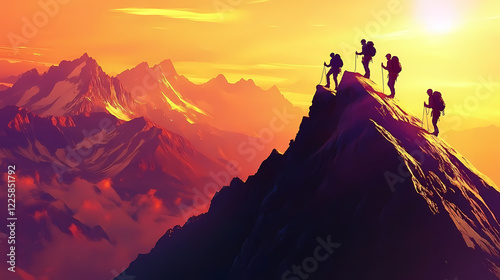 team, climber, ascending, infused, rugged, mountain, ridge, silhouetted, dramatic, vibrant, sunrise, warm, gold, light, long, shadow, illuminate, distant, peak, gilded, illustration