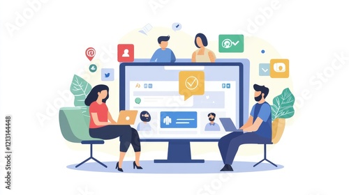 communication, online, team, collaboration, virtual, platform, network, digital, cyberspace, connecting, people, computer, laptop, social, media, icon, technology, meeting, user, sharing, interaction, community, profile, screen, check, message, connection, monitor, leaf, plant, chair, woman, man, work, office, group, account, mail, twitter, video