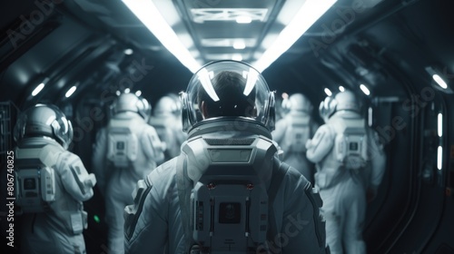 Team of astronauts in a space suits aboard the orbital station. A crew of cosmonauts piloting the spaceship. People in space. Galactic travel and science concept.