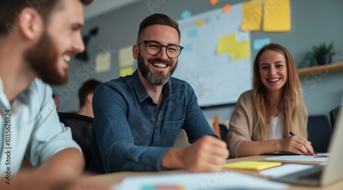 Team of business professionals having a work meeting in the office. Group of happy young people analyzing marketing data and developing new strategies.