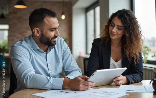 Team of diverse partners sitting at table mature Latin business man and European business woman discussing project on tablet in office. Two colleagues of professional business people working together.