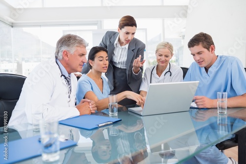 Team of doctors and businesswoman having a meeting