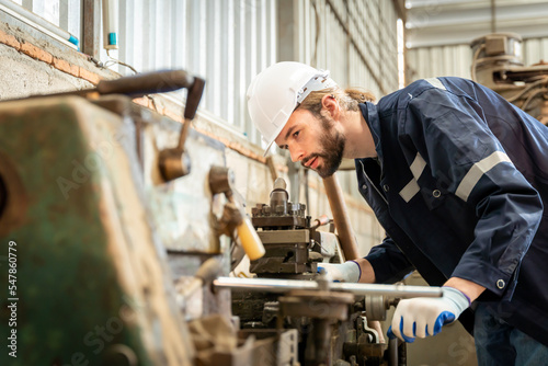 Team of engineers practicing maintenance Taking care and practicing maintenance of old machines in the factory so that they can be used continuously.