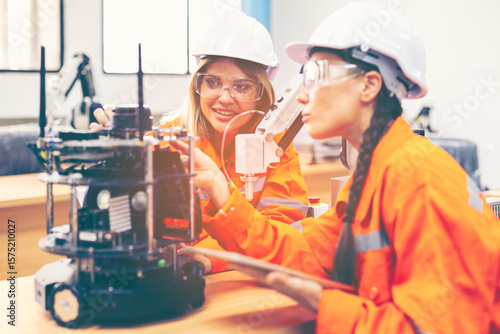 Team of male and female engineers checking or maintenance electronic in AI Robot, robot arm in the manufacturing automation and robotics manufacture room.