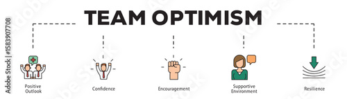 Team Optimism infographic icon flow process which consists of Positive Outlook, Confidence, Encouragement, Supportive Environment, Resilience.