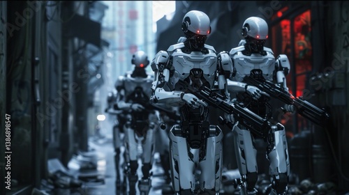robot, army, military, soldier, city street, team, gun, machine, security, battlefield, squad, technology, futuristic, cyber, aisle, artificial intelligence, science fiction, carrying, weapon, cop, modern, force, combat, innovation, warfare, fight, armored, outdoors, epic, war, fiction, formation, shoot, walk, character, future, helmet, gear, conflict, control, advance, video game, defense, strategy, mechanized, field, ai