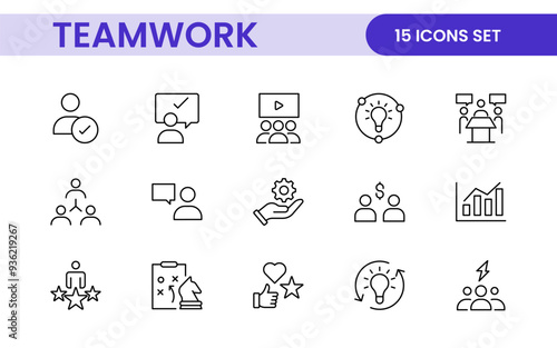 Teamwork linear icons collection. Set of coworking space icons. Business teamwork, team building, work group, and human resources minimal thin line web icon set.