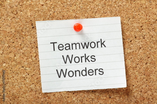 teamwork, work, wonders, cooperation, working together, pull together, expertise, joint venture, notice board, bulletin board, drawing pin, memo, message, phrase, word, typescript, text