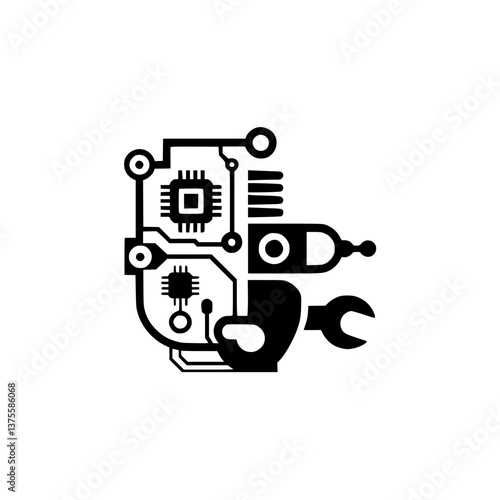 vector, circuit board, icon, black, white, graphic, illustration, technology, repair, hot drink, mug, wrench, geometric, minimalist, processor, microchip, information technology, electronic, coding, development, software, computer, abstract, logotype, hardware