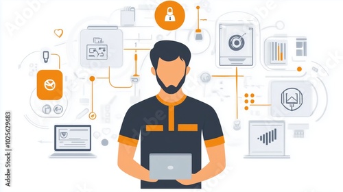 Technical support flat illustration. Man with icons.
