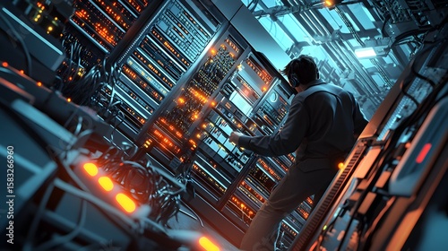 glowing, wire, work, detail, operating, server, light, large, technician, rack, datum, equipment, bright, energy, modern, focused, intense, cable, system, dark, electrical, technology, maintenance, computer, room, network, digital, futuristic, control, infrastructure, interior, engineer