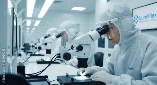 Technicians in protective suits adjusting microLED wafer alignment using optical microscopes in a spotless lab.