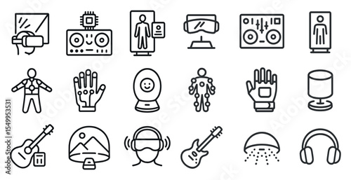 technology, line art, flat, solid, outline, vector, icon, set, symbol, music, tech, audio, earphones, computing, ai, innovation, machine, datum, futuristic, interface, cyber, wireless, multimedia