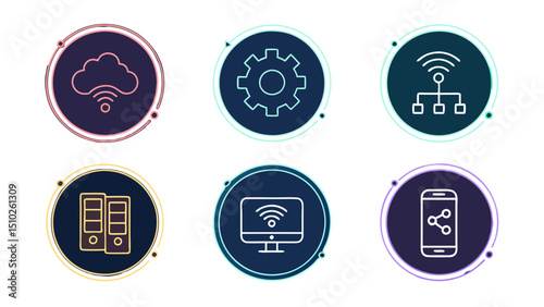 Technology and Networking Line Icons Set including cloud, network, phone, app, and settings with glowing edges and modern gradient style.
