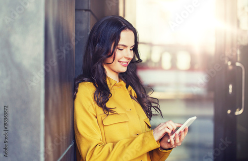technology, communication and people concept - smiling young woman or girl texting on smartphone on city street