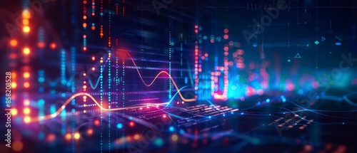 Technology merges with business as digital data charts and graphs monitor financial waves, illustrating stock patterns and market trends