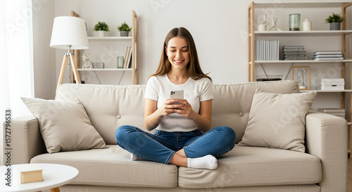 Tech-Savvy Serenity: A smiling woman contentedly sits on a plush sofa, engrossed in her smartphone, epitomizing the fusion of technology and domestic tranquility.