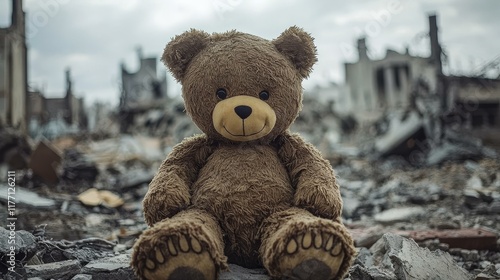 teddy, bear, toy, disaster, ruin, destruction, war, city, landscape, abandoned, childhood, loss, hope, sad, emotional, trauma, devastation, refugee, broken, orphan, support, orphanage, rescue, comfort, care, help, misery, poverty