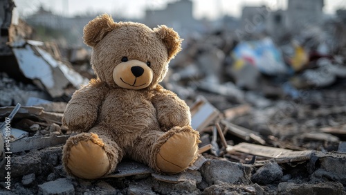 Teddy bear sits alone among rubble in devastated area