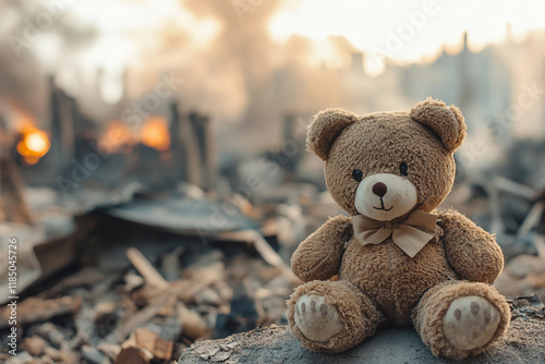 teddy bear, destruction, ruin, smoke, landscape, aftermath, fire, sitting, childhood, memory, soft toy, abandoned, debris, grieved, nostalgia, survival, tragedy, resilience, innocence, loss, safety, warmth, desolation, hope, heartwarming, contrast, emotional, environment, unbroken, plush toy, vulnerability, forgotten, haunting, remain, urban decay, poignant, timeless, imagery, displaced