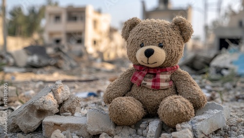 Teddy bear sits amidst the ruins of a destroyed neighborhood