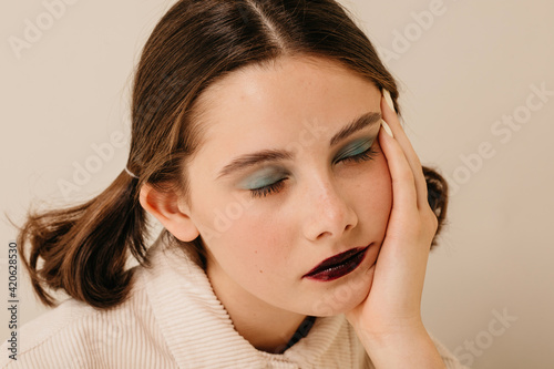adorable, appearance, asleep, beauty, brunette, calm, character, cosmetic, delicate, exhausted, eyes closed, eyeshadow, face, fashion, feminine, gentle, hair, head shot, horizontal, human face, individuality, lean, lip, lipstick, make-up, model, nap, peaceful, honed, personality, pigtail, portrait, pretty, quiet, relax, rest, sleep, snooze, soft, studio, studio shot, style, support, tender, sleepy, tranquil, trendy, vibrant, high-coloured, vogue, young