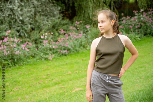 Teenage girl, against green summer park. Confident young woman portrait. Copy space