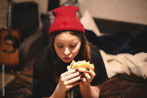 girl, authentic, bed, bedchamber, burger, candid, carefree, caucasian, cheeseburger, dinner, dorm, eating, enjoying, enjoyment, fast food, female, food, hamburger, hat, hipster, holding, home, individuality, indoor, lifestyle, looking down, meal, 1, people, person, portrait, real, real people, room, sitting, student, teenage, teenage, teenage girl, teenage, thinking, thoughtful, unhealthy, well-being, woman, young adult, missy, youth culture