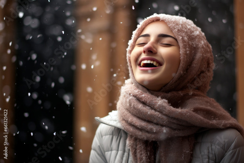 Teenage girl giggling, catching snowflakes on her tongue.