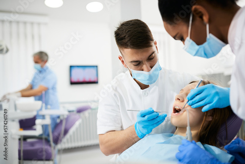 Teenage girl having teeth check-up during appointment with dentist.