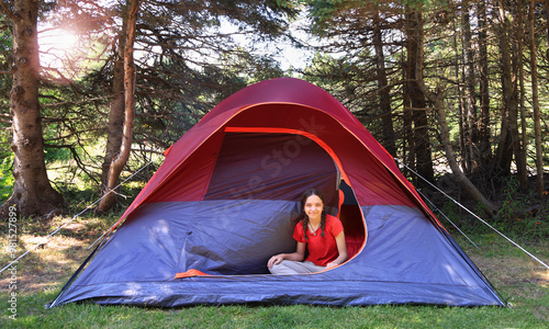 teenage, girl, standing, red, blue, tent, campground, green, grass, tree, sun, colourful, adventure, hiking, quebec, canada, forest, estuary, north america, nature, fresh air, journey, children, young, north, day, horizontal, lifestyle, field, happy, beautiful, active, campground, countryside, bright, sunny, ray, glowing, glow, shadow, activity, healthy, landscape