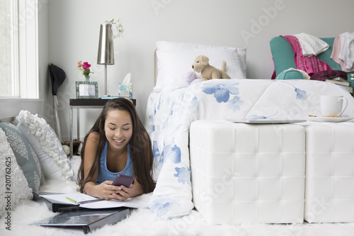 Teenage Girl texting in her bedroom