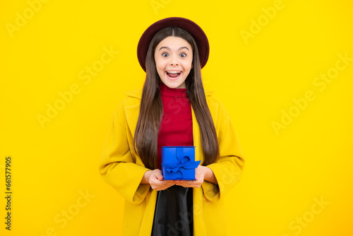 Teenager child with gift box. Present for holidays. Happy birthday, Valentines day, New Year or Christmas. Kid hold present box. Excited teenager, glad amazed and overjoyed emotions.